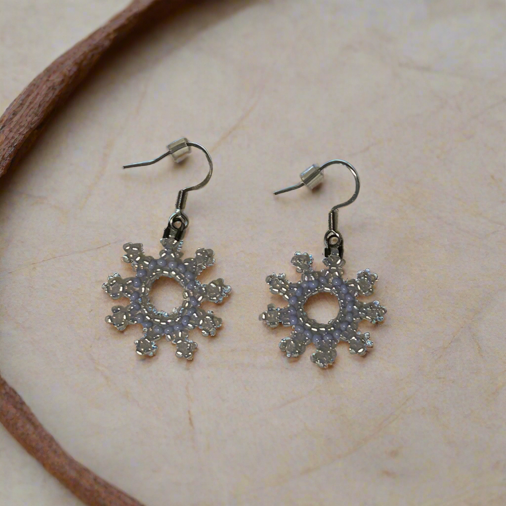 Beaded snowflake with lavender accents in stainless steel hooks.