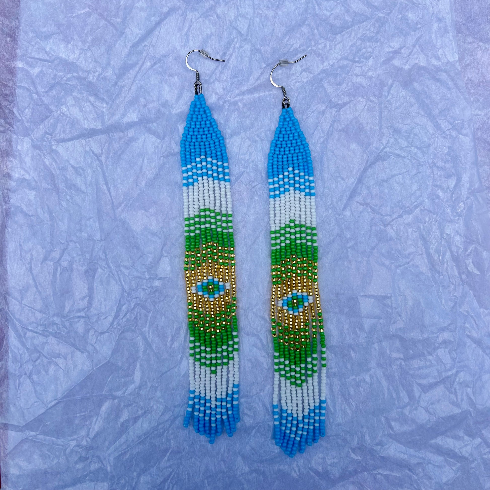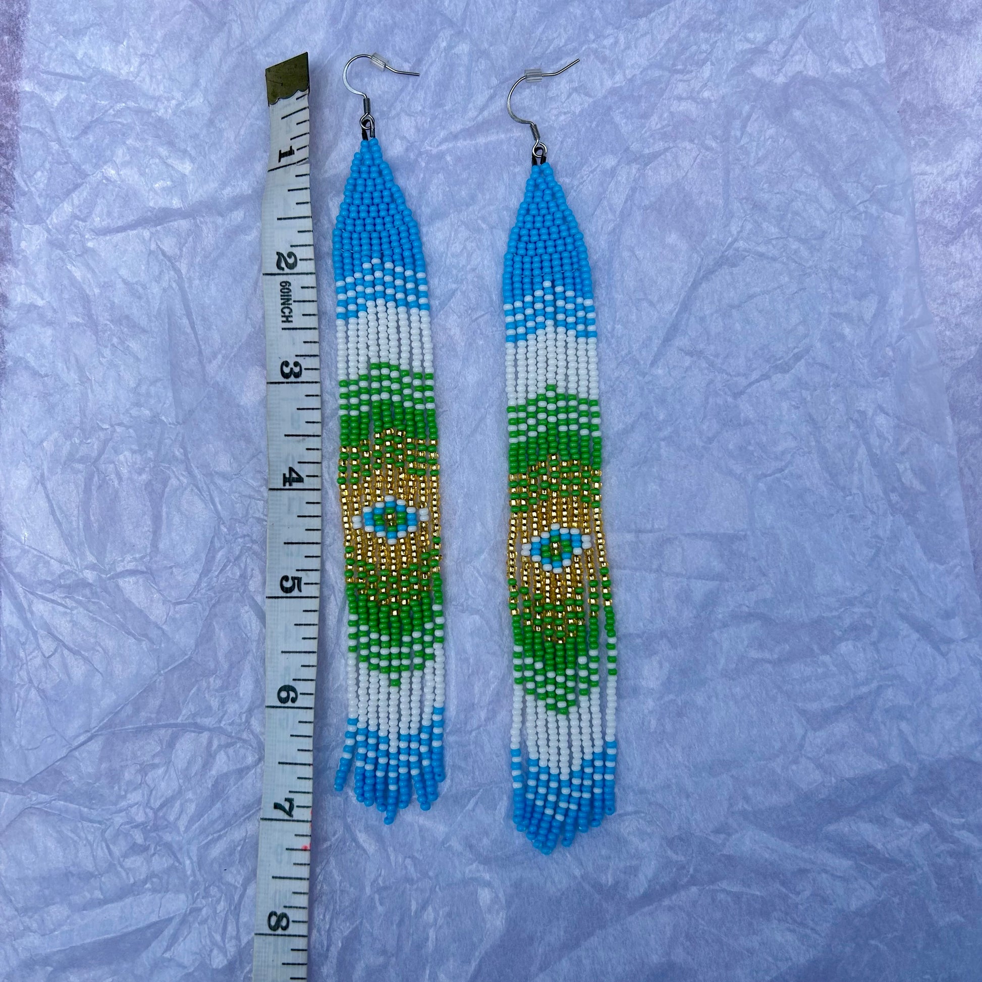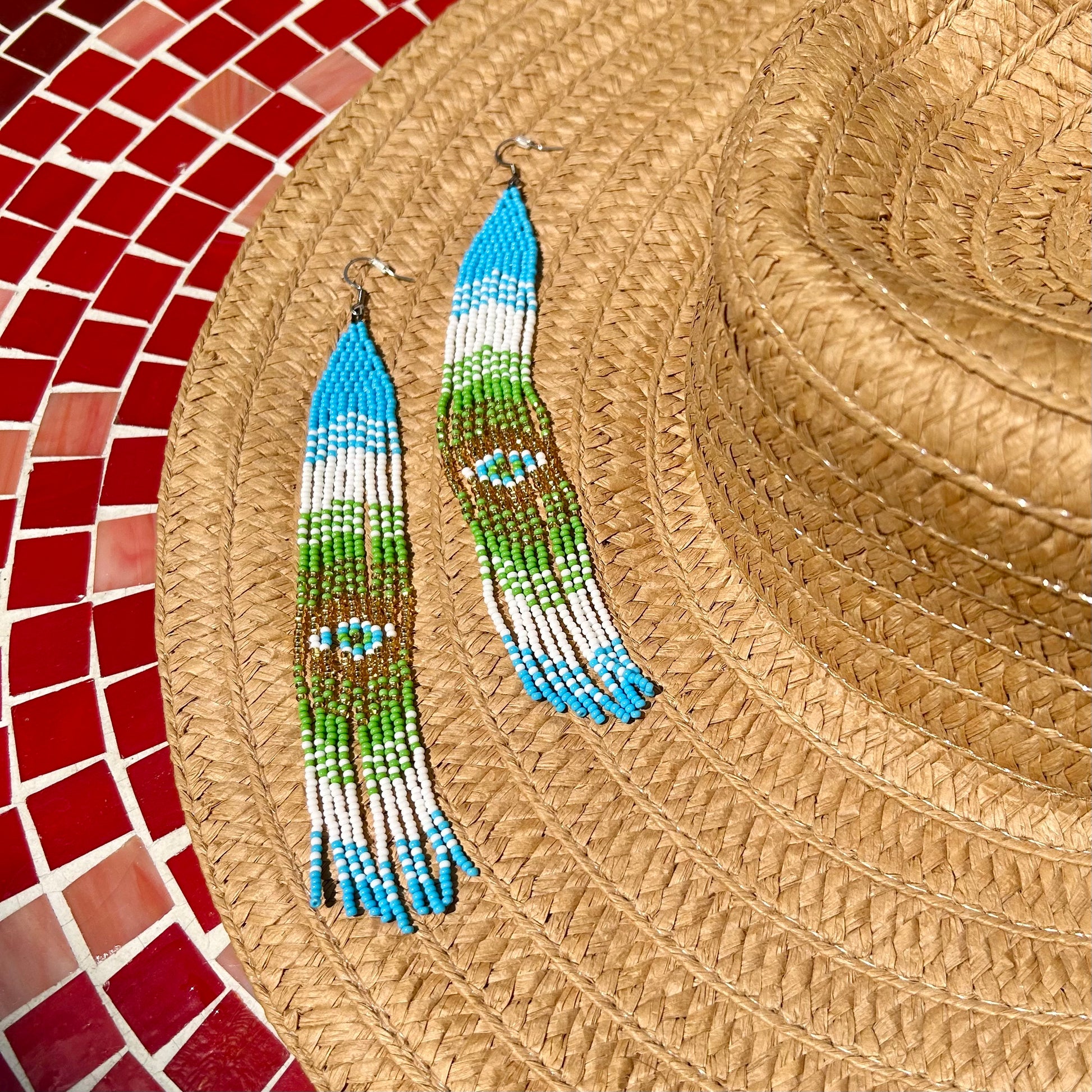 7 inch fringe earrings on stainless steel hooks inspired by the Guatemalan flag.